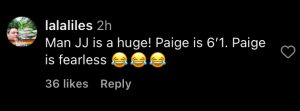 “Man JJ is huge! Paige is 6’1″. Paige is fearless 😂😂😂” another pointed out.