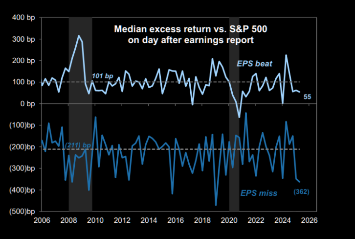 Technically, there is nothing wrong with the market as a normal pullback occurs. Retail investors continue to step in and “buy the dip,” as greed permeates the markets. However, earnings season is winding down, and earnings beats are getting a muted reaction. On average, stocks beating estimates are only outperforming by 55 bp vs. the 101 bp historical average. This is likely due to overly low analyst expectations. Meanwhile, earnings misses are being punished nearly twice as much as usual.