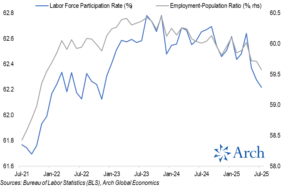 The labor force participation rate dropped from a recent peak of 62.8% in Nov ’23 to 62.2% in July ’25. The pace of that decline accelerated sharply in May and has continued through July.