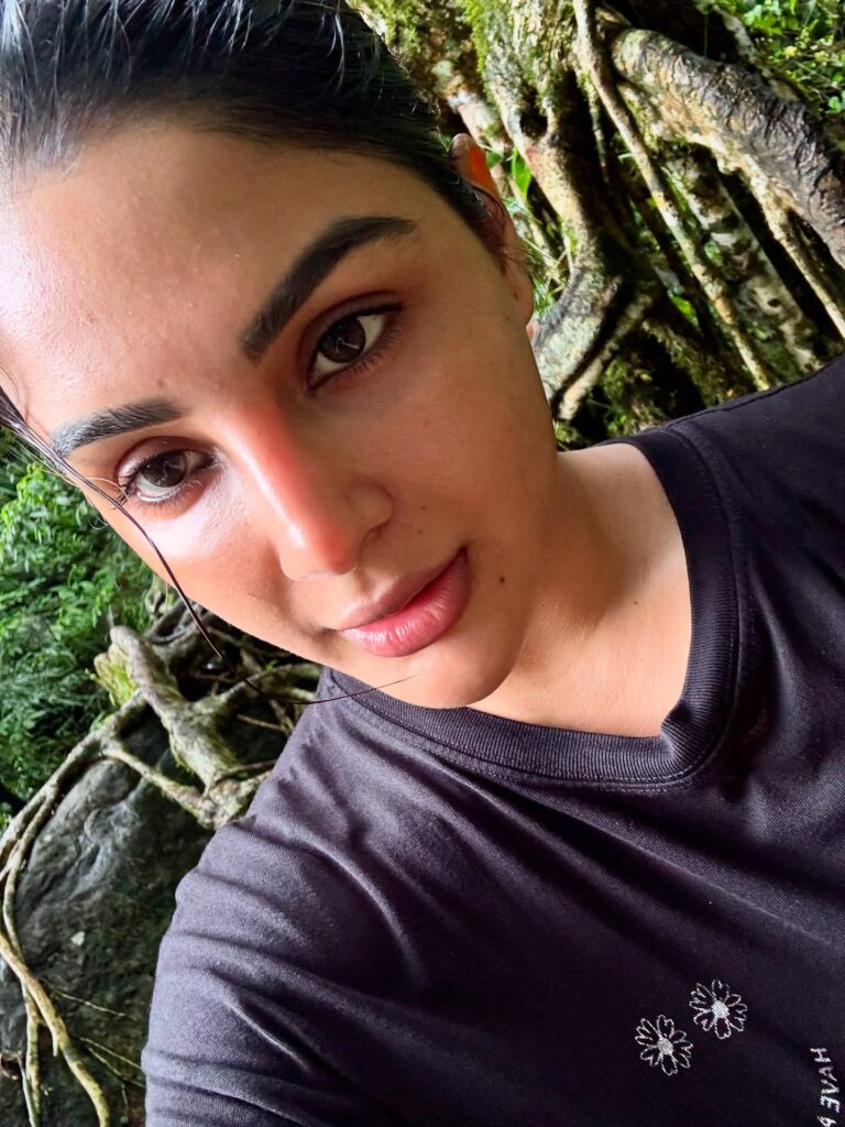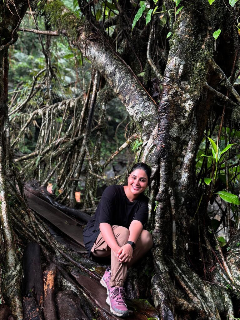 The Virupaksha actress went on a peaceful but bit of risky trek through a lush green forest and visited the famous ‘Living Root Bridge,’ a natural bridge made from tree roots. The forest looked calm and refreshing, but her fans are too scared, as these days, many natural disasters are happening. But she seemed to enjoy every moment and took a full-on break from the shoot mode, even relaxing in a tree and soaking in the peace.