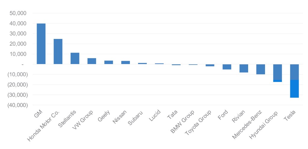 In the U.S. EV market, the two largest movers in the first half of 2025 were General Motors, the largest automaker in the U.S., and Tesla, the largest EV maker. General Motors, after some delays, is finally streaming a strong collection of EVs to market across its Cadillac, Chevrolet and GMC brands. GM sold more than 78,000 EVs in the first half of 2025, more than twice the volume posted in 2024. Chevrolet was the No. 2 best-selling EV brand in the U.S. at the end of the first half, charging passed both Ford and Hyundai and helping grow GM’s share of total EV sales to 12.9%, placing GM firmly as the No. 2 EV player and behind only Tesla.
