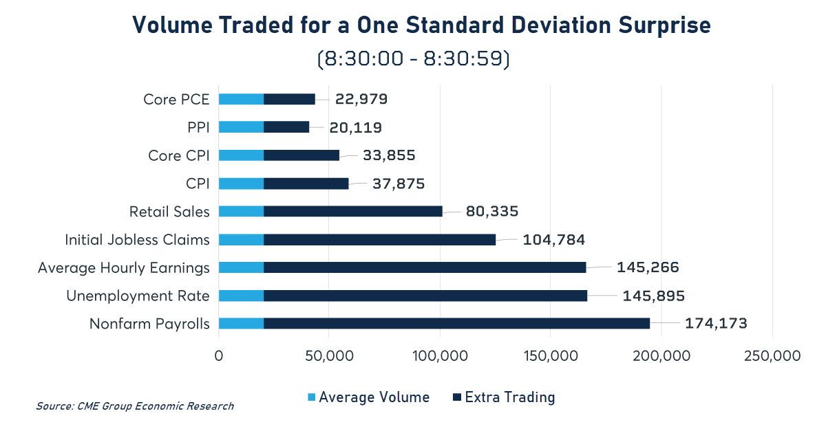 Employment reports, particularly the nonfarm payroll jobs growth number (NFP), have the most significant impact on trading volumes in interest rate futures and options.Despite the post-pandemic inflation surge, retail sales data has emerged as the second most influential economic indicator for traders.